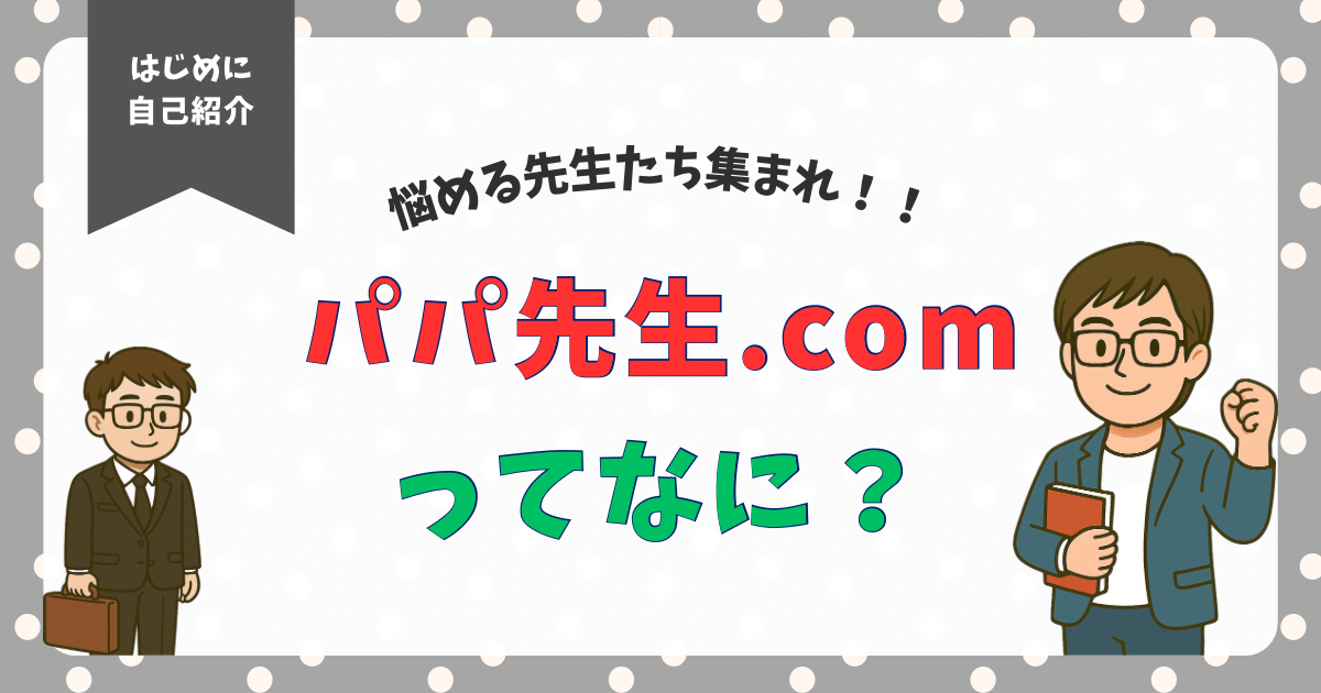 はじめに 2025.08.212025.09.02 パパ先生 はじめまして。パパ先生です。 「パパ先生.com」は,「昨今暗いニュースばかりの教育界で必死に働いている先生たちが,勤務時間を終えて『先生』という制服を脱いだ後の時間を,豊かに生きられるようにサポートしたい」という想いから立ち上げました。 全国の先生たちの, 毎日遅くまで残業し,帰ったら寝るだけの日々… 自分の子育てに時間が取れず,家庭がうまくいかない… 仕事のストレスで,精神と共に貯金もすり減っていく… といった悩みを解決するためのヒントを,ここでは発信していきます。